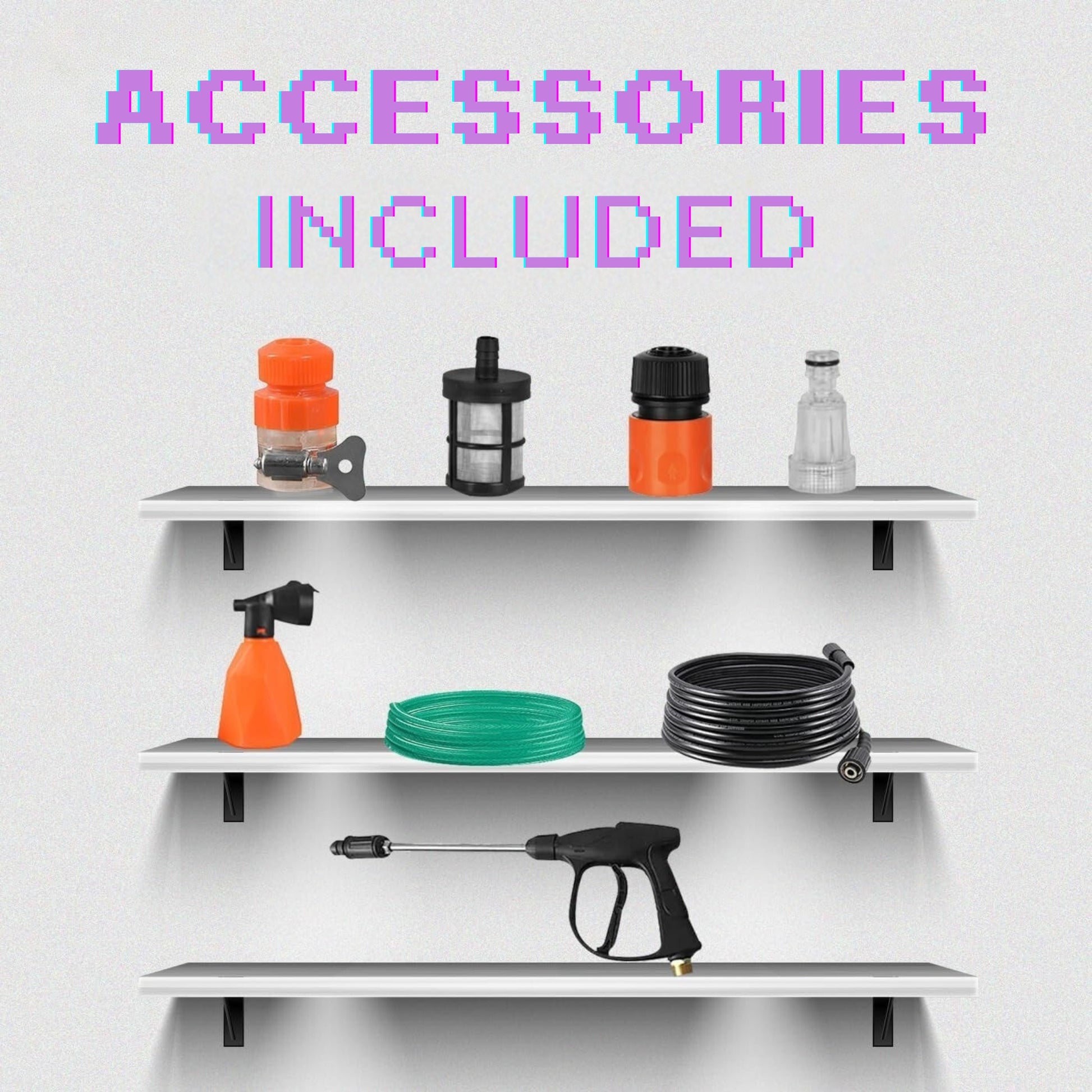 - Venturi system, Auto Stop, Self-intake function, Pressure gauge, variably adjustable fan spray lance, Water filter, It can effortlessly perform a wide range of cleaning tasks. With increased cleaning efficiency and consistent cleaning outcomes, tough dirt, scale, oil, and rust may be removed quickly and easily in seconds, assisting in the creation of a cleaner and more comfortable living environment. Pressure washer provides strong water flow, easily and quickly clean your car, siding, decks, kids' outdoor toys, patio furniture, garbage cans, pet cages, outdoor equipment, etc.,